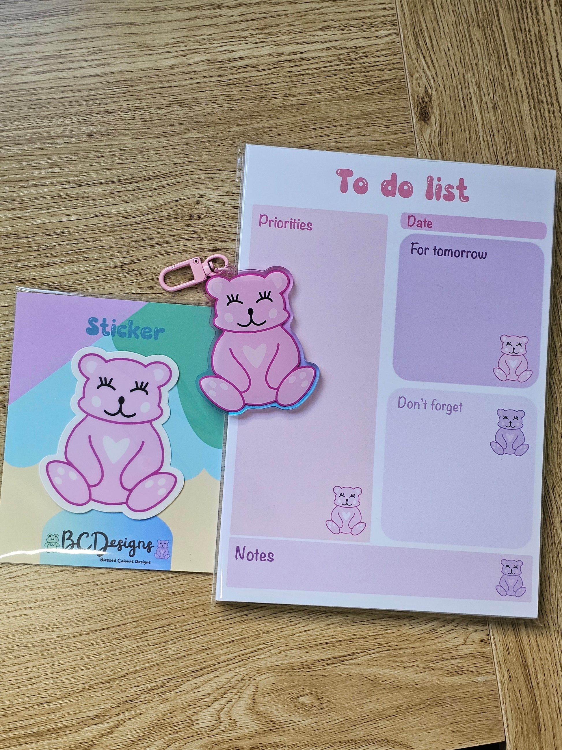 This complete Beary Bear set features a charming pink theme, including an A5 notepad, a keychain, and a waterproof sticker. Perfect as a thoughtful gift for yourself or a loved one who adores pink, this set combines practicality with adorable style. Brighten your day or theirs with these delightful accessories designed to bring joy and a touch of sweetness wherever they go.