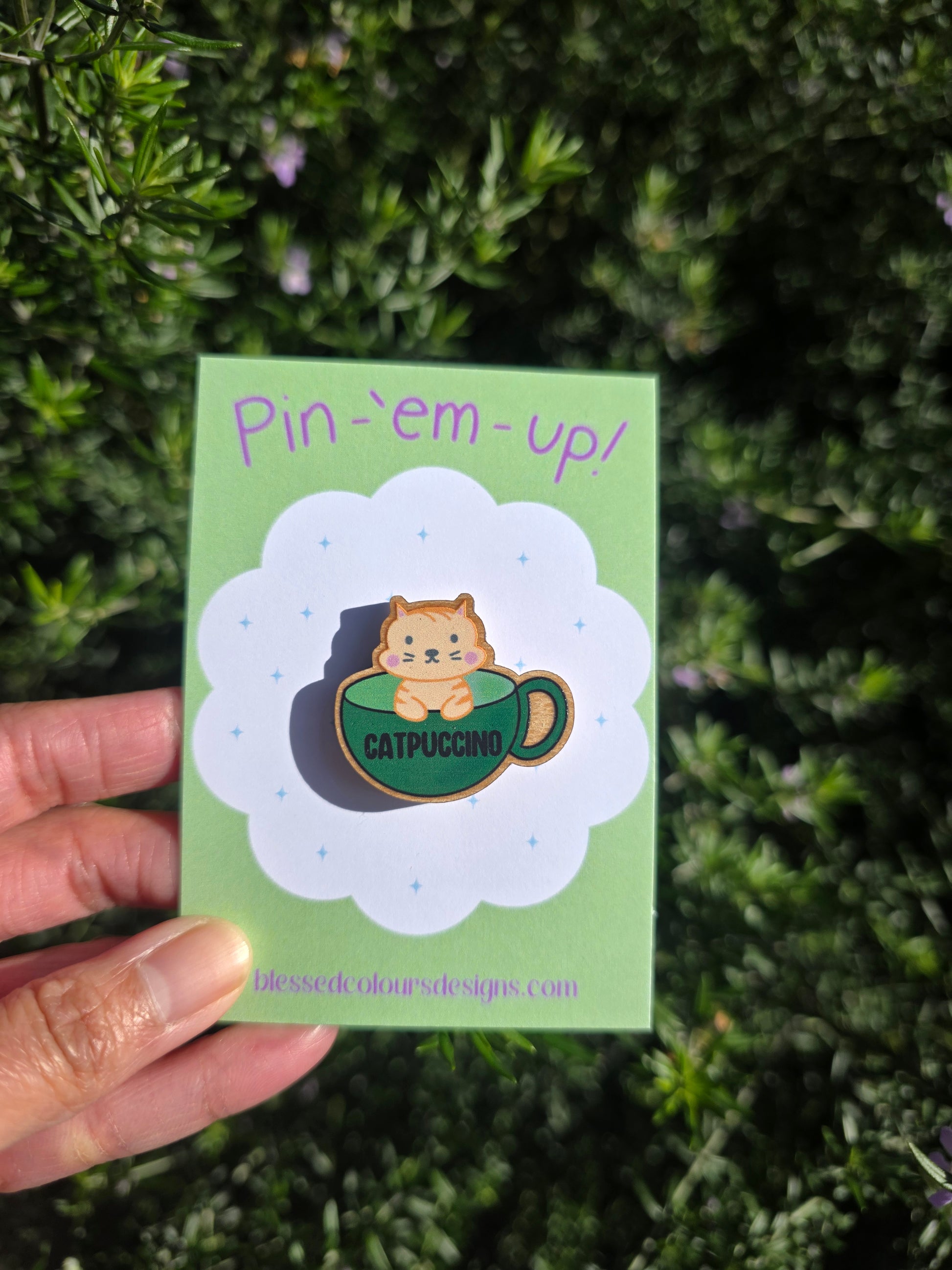 Add a touch of charm with the Catpuccino wooden pin, featuring an irresistibly cute cat nestled in a mug. This unique accessory makes a thoughtful gift or a delightful treat for yourself. Perfect for decorating your bag, lanyard, shirt pr wherever you want to pin-em-up! This is made from responsibly sourced wood.