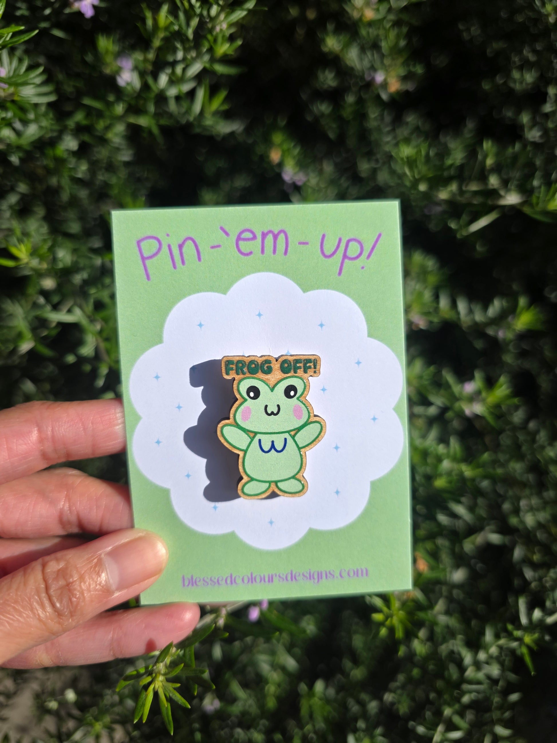 This Frog Off wooden pin features an adorable frog design crafted from responsibly sourced wood. It's a charming accessory perfect for decorating your bag, lanyard, shirt, or any place you want to add a touch of fun. A great gift for frog lovers and anyone who enjoys unique pins.