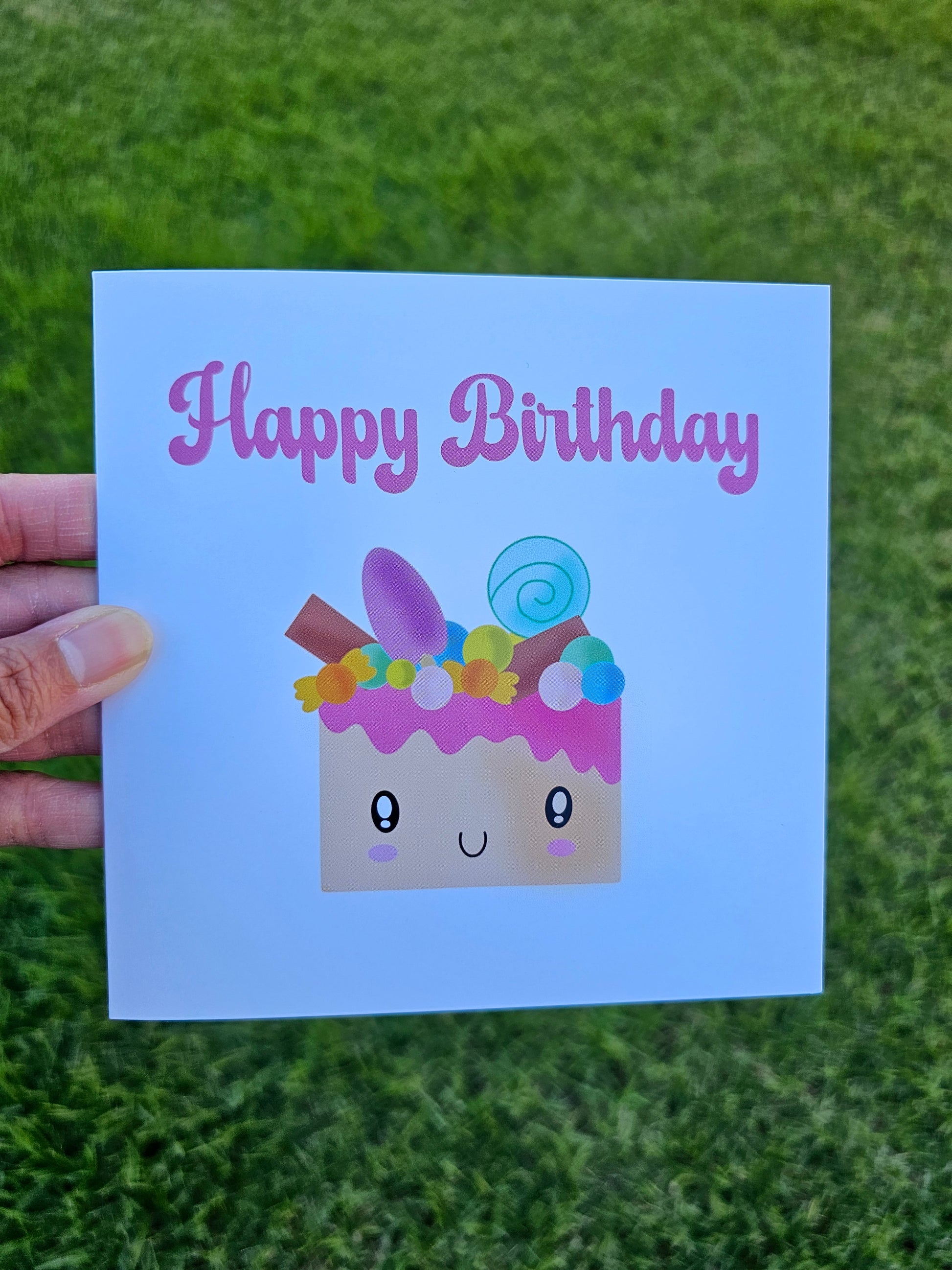 Celebrate a special day with our Happy Birthday cake card! This adorable greeting card features a cute cake with delectable sweets on top. Perfect for anyone with a sweet tooth (or a sweet personality), it's a fun and playful way to wish them a happy birthday.
