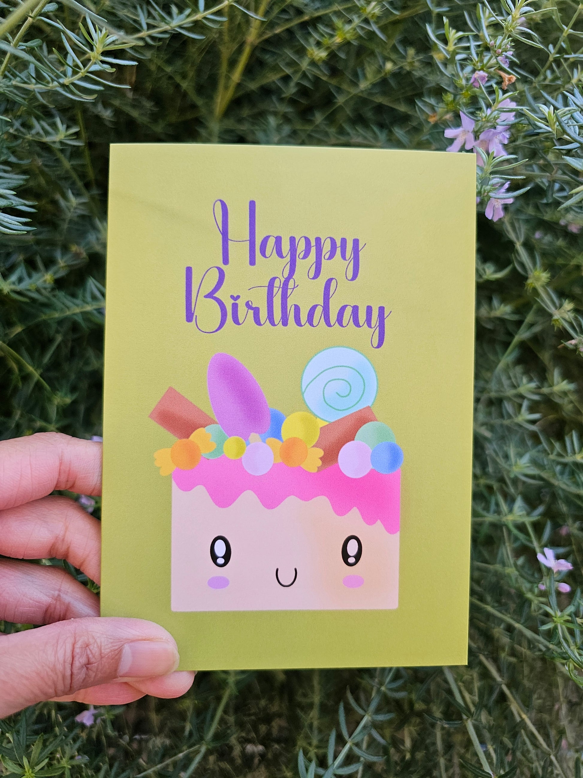 Celebrate a special birthday with our Happy Birthday cake card! This charming card showcases a delicious cake topped with scrumptious lollies, making it the perfect choice for anyone's special day. Show your love and appreciation with this cute and festive card.