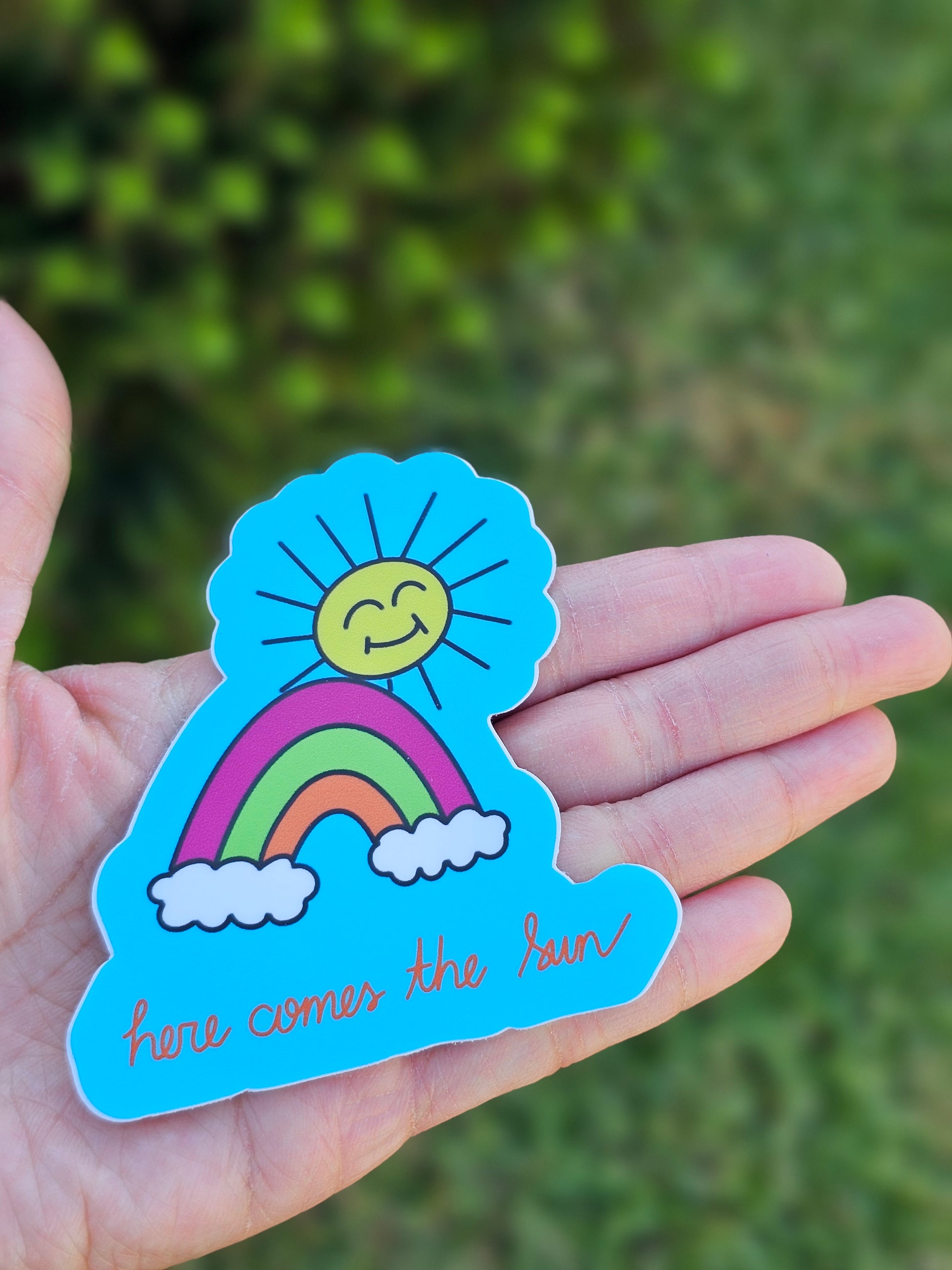 Get ready to stick it to the elements with our waterproof die cut sticker, Here comes the sun! Perfect for outdoor use, this sticker will add some sunny vibes to your gear. Don't let rain or shine keep you from showing off your style. Let the sun shine on with our sticker!