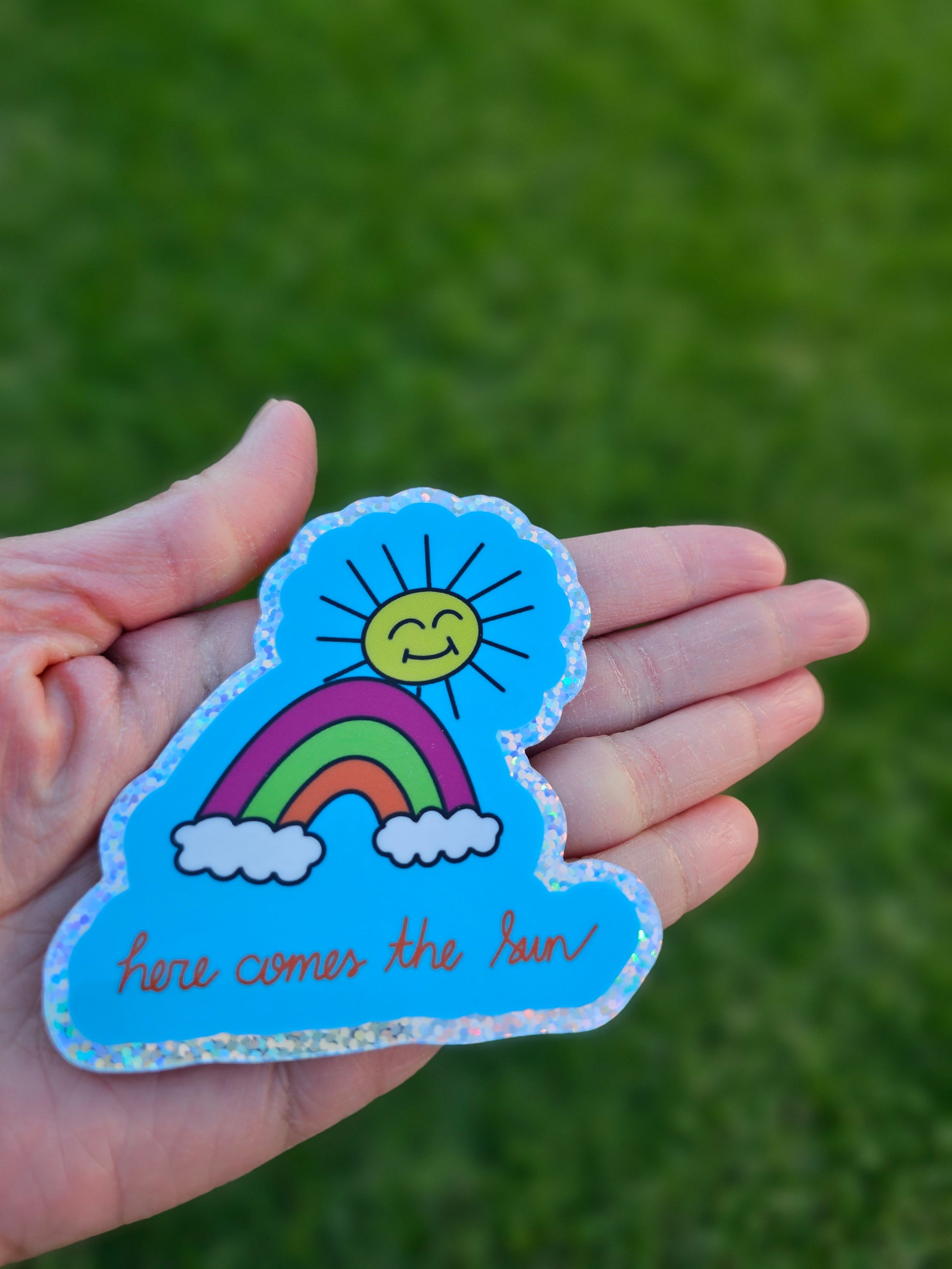 Get ready to stick it to the elements with our waterproof die cut sticker, Here comes the sun glitter sticker! Perfect for outdoor use, this sticker will add some sunny vibes to your gear. Don't let rain or shine keep you from showing off your style. Let the sun shine on with our sticker!