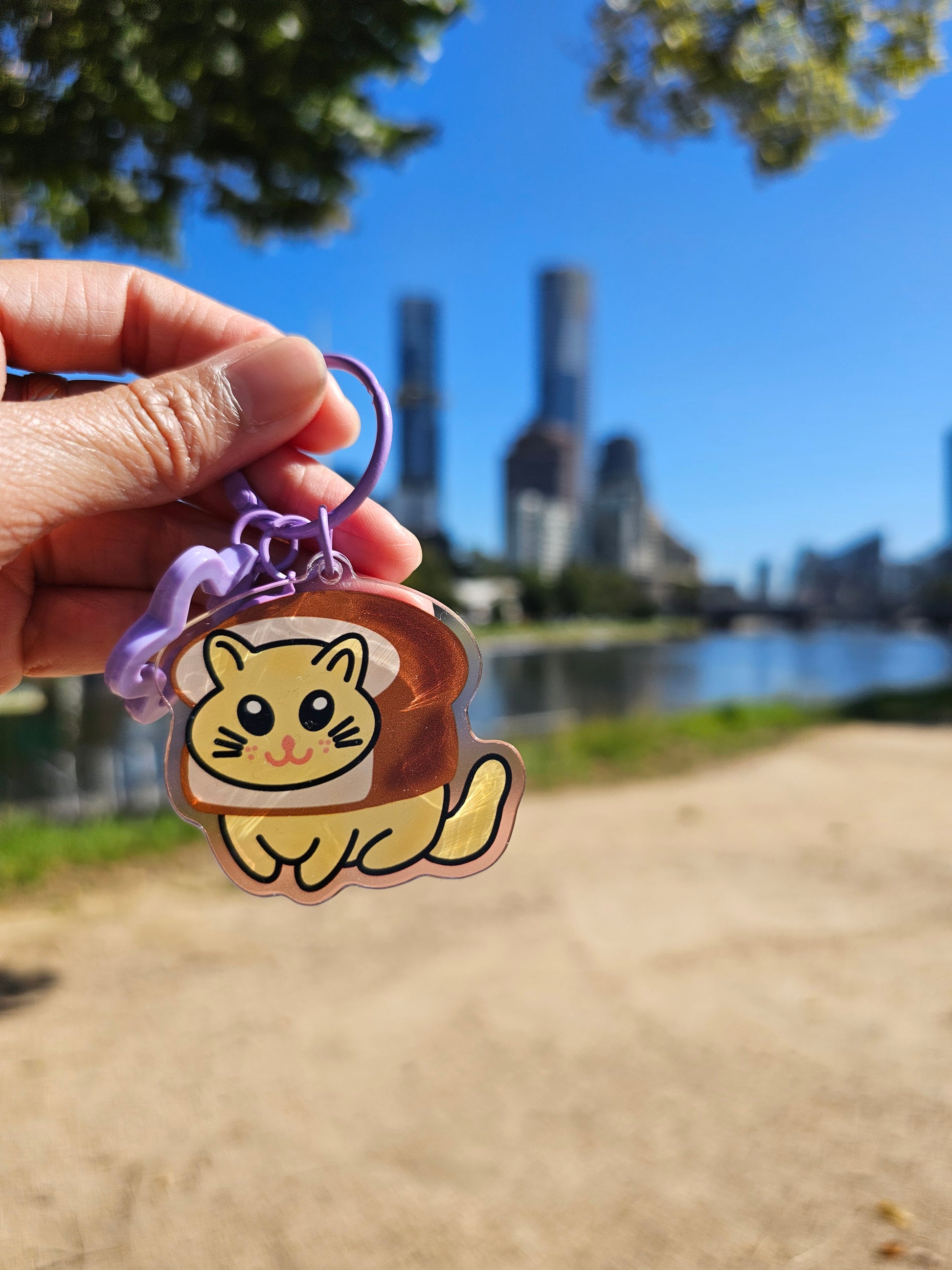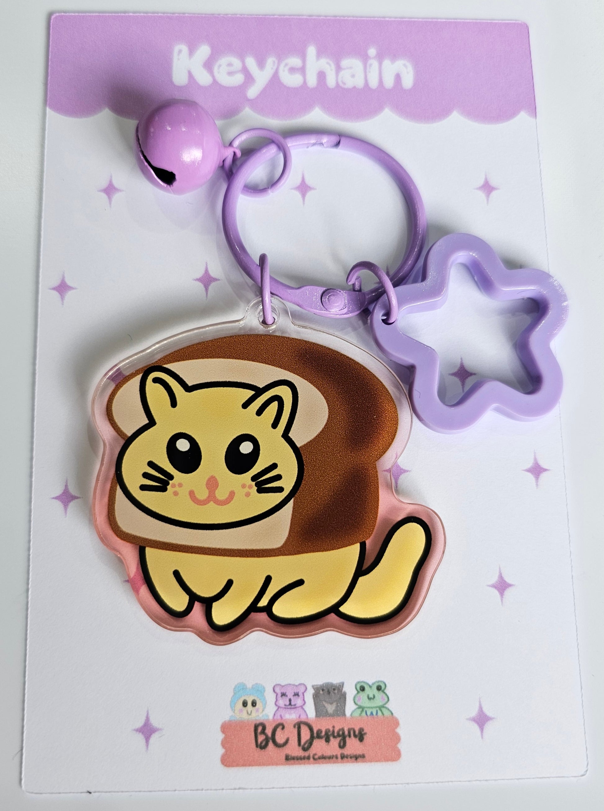 This adorable keyring is the purr-fect accessory for any cat lover! Featuring a cute cat loafed in bread, it's sure to bring a smile to your face. The purple keyring comes with a small bell and measures 2 inches in size. Show your love for cats in a fun and quirky way with "I loaf you Catty"!