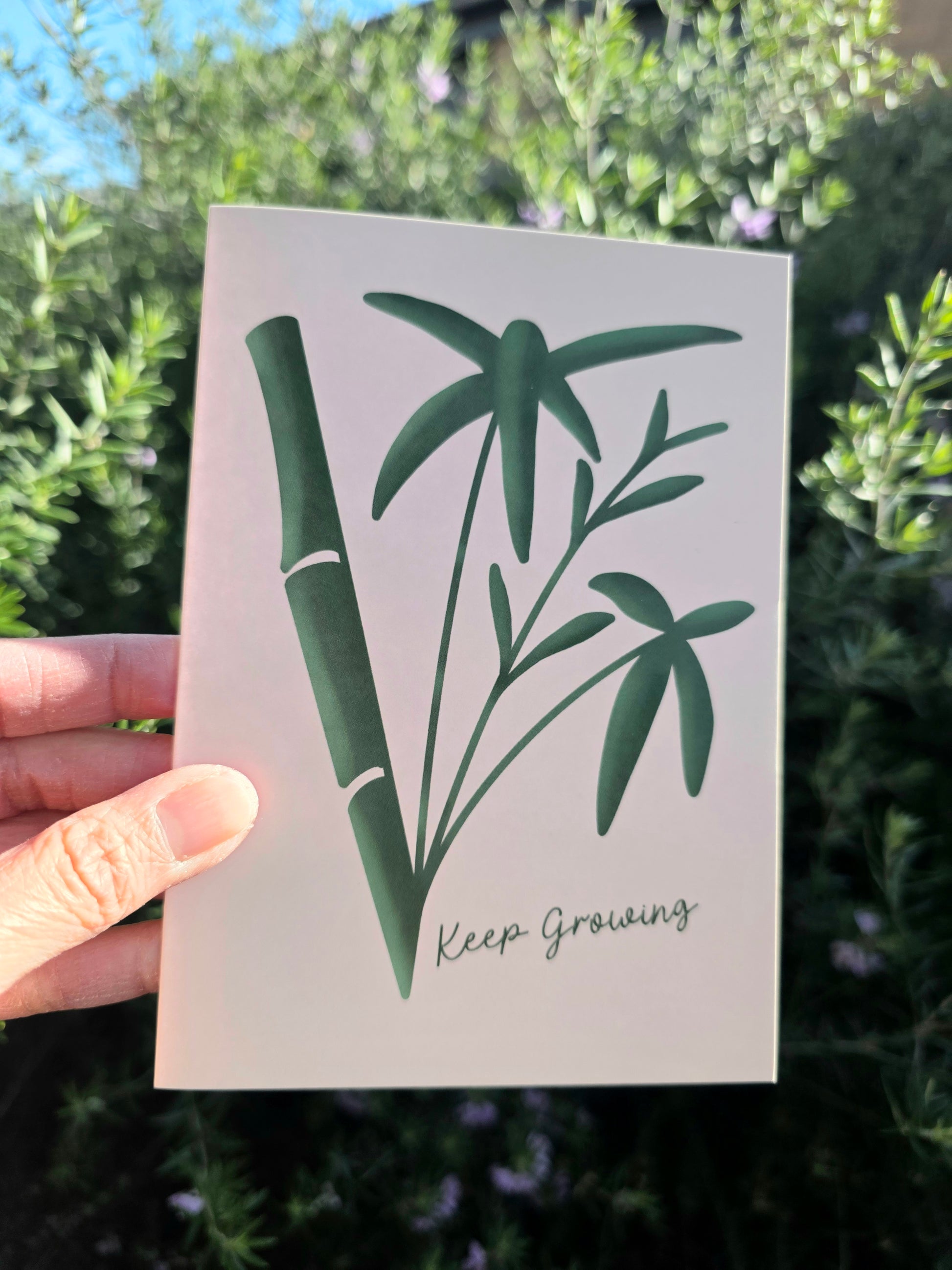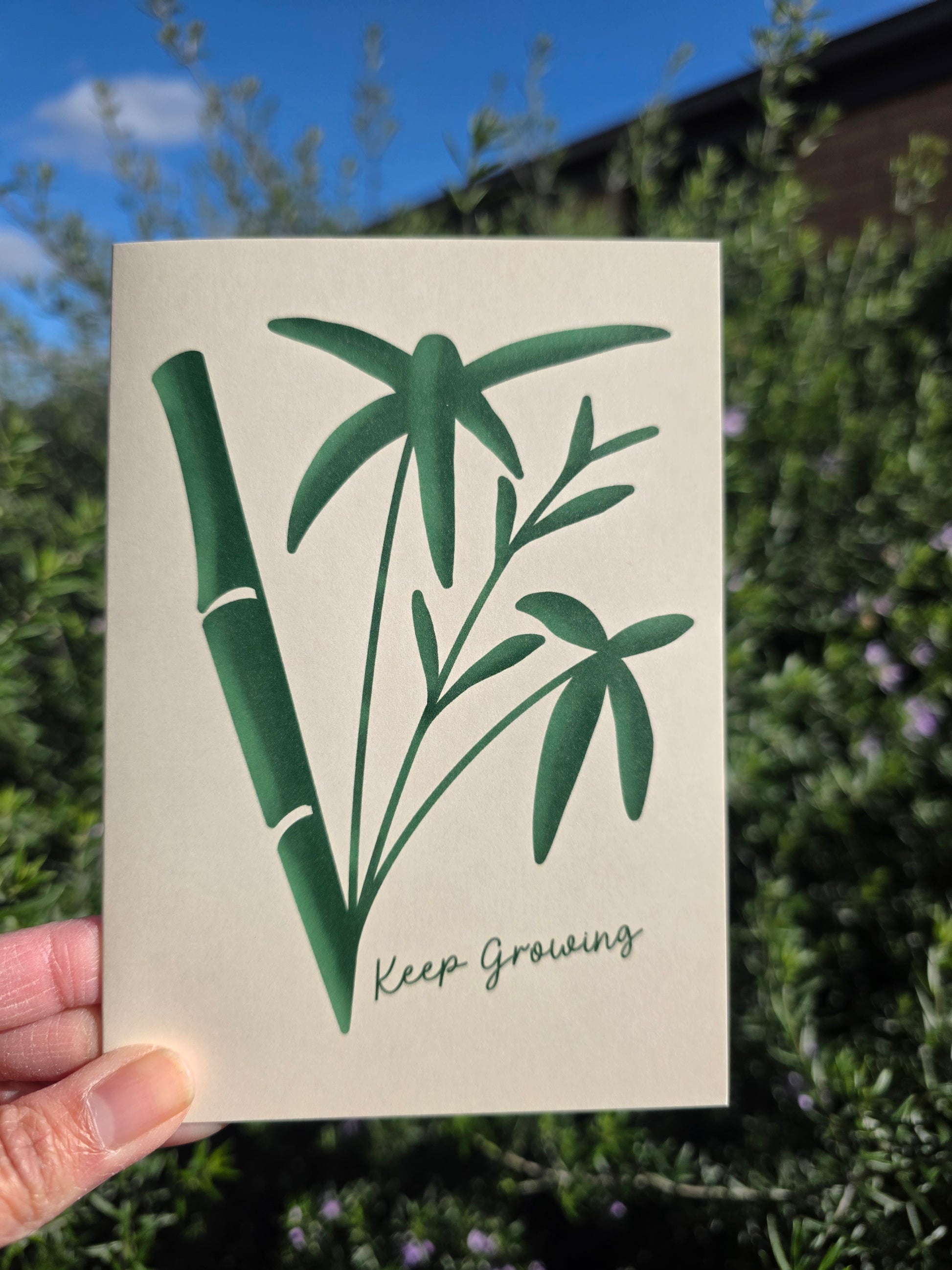 Celebrate growth with the Keep Growing card, beautifully illustrated by us with a thriving bamboo design. This card inspires positivity and encouragement, making it perfect for anyone embarking on a new journey or facing challenges. Send a message of strength and hope to your love ones or friends.