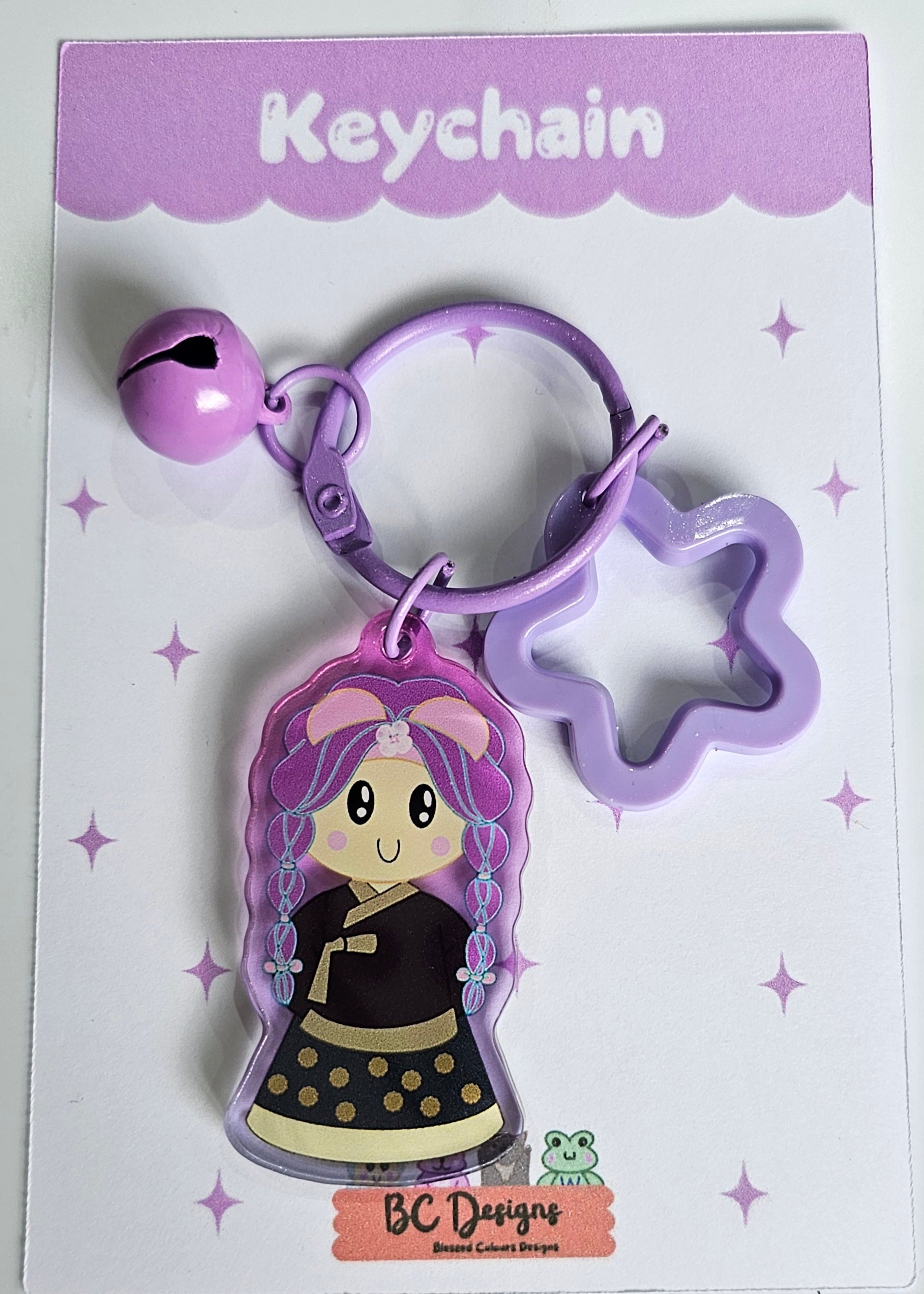 Carry a piece of traditional Korean culture with you wherever you go with our Mini Momofoco hanbok keychain! Featuring a purple key ring and a small round bell, this 5cm (1.96 inches) charm is both functional and cute. Perfect for adding a unique touch to your keys or bag.