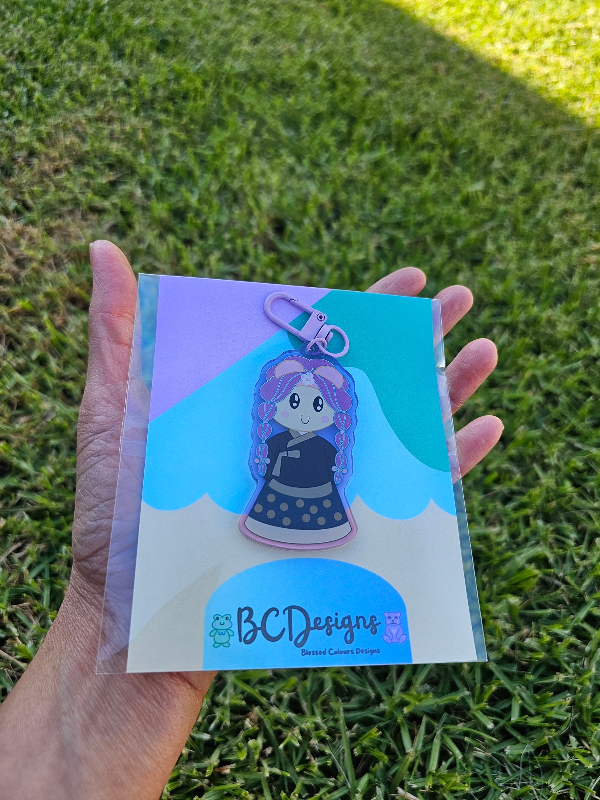 Add a pop of colour to your keys or bag with the Momofoco Hanbok purple keychain! Measuring at 70mm, this cute keychain features a purple-haired character wearing a traditional hanbok. A perfect accessory to show off your playful and quirky side.
