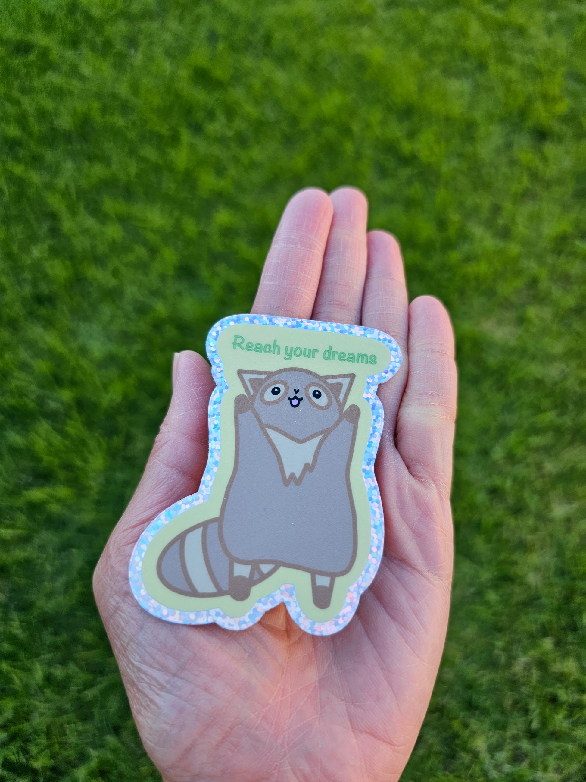 Bring some fun and motivation to your belongings with our waterproof Raccoon Reach Your Dreams glitter sticker! This cute and kawaii sticker is sure to make you smile and keep you inspired. Stick it anywhere and let the raccoon help you reach for the stars (or at least your dreams)!
